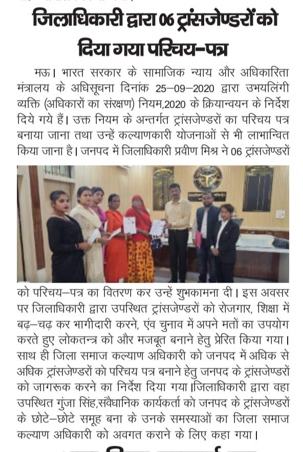 टीजी समुदाय के कल्याण के क्षेत्र में उत्कृष्ट कार्यों के लिए सतरंगी फाउंडेशन मऊ की प्रमुख और टीम को जिलाधिकारी, समाज कल्याण अधिकारी, डूडा अधिकारी, एडीएम साहब और नगर पालिका चेयरमैन द्वारा कई बार सम्मानित किया गया है। यह ...