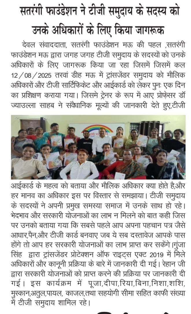 सतरंगी फाउंडेशन मऊ ने समाज के वंचित और विशेष रूप से ट्रांसजेंडर (टीजी) समुदाय के सशक्तिकरण, सम्मान और आत्मनिर्भरता के लिए कई महत्वपूर्ण कार्यक्रम सफलतापूर्वक पूर्ण की हैं। संस्था के कार्यों ने न केवल सामाजिक दृष्टिकोण में सकारात्मक परिवर्तन लाया है, बल्कि शासन और प्रशासन को भी समावेशी विकास की दिशा में प्रेरित किया है।